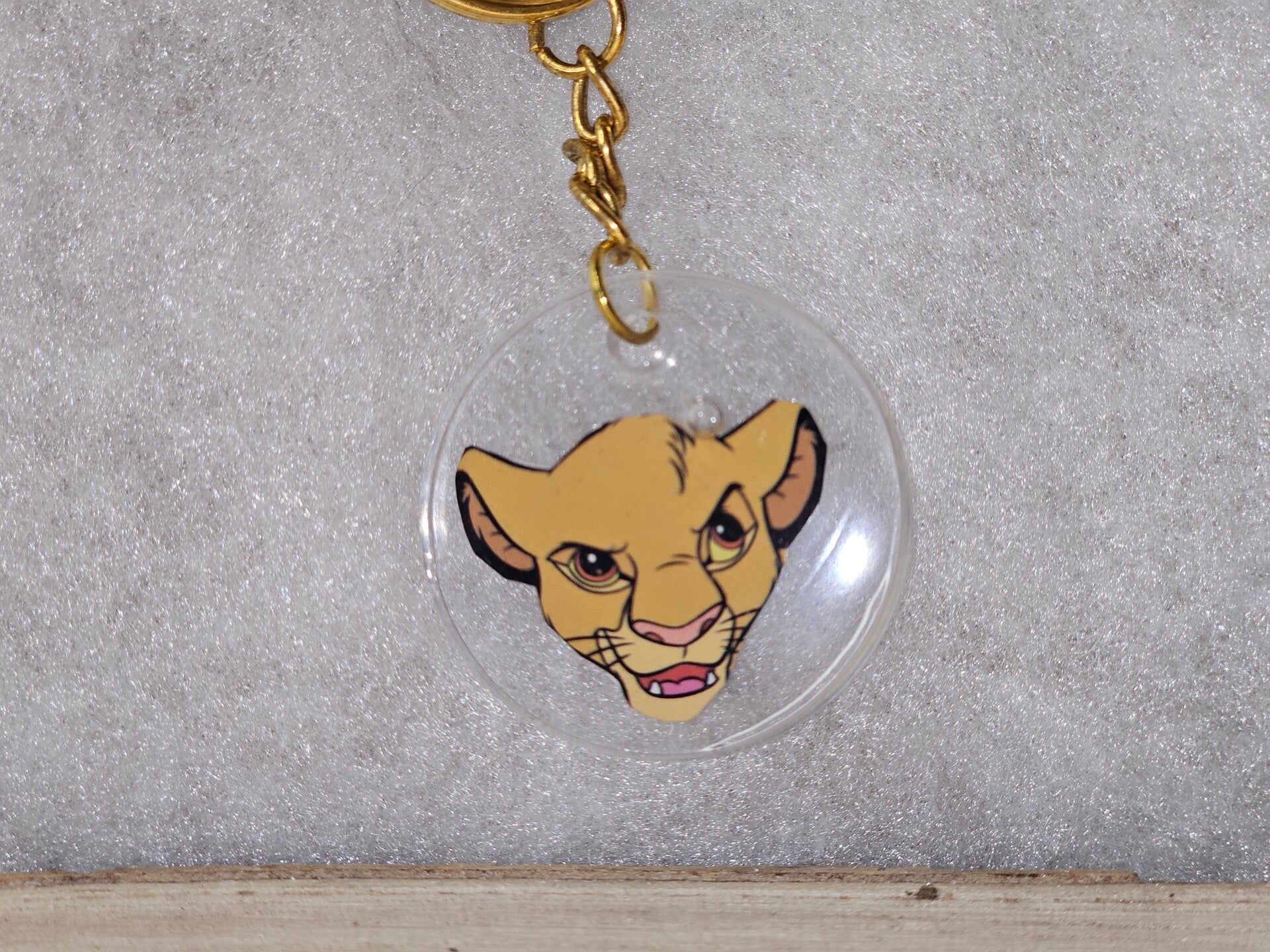 - L'image du visage joyeux de Nala ou Simba est scellée dans une résine ronde et transparente.