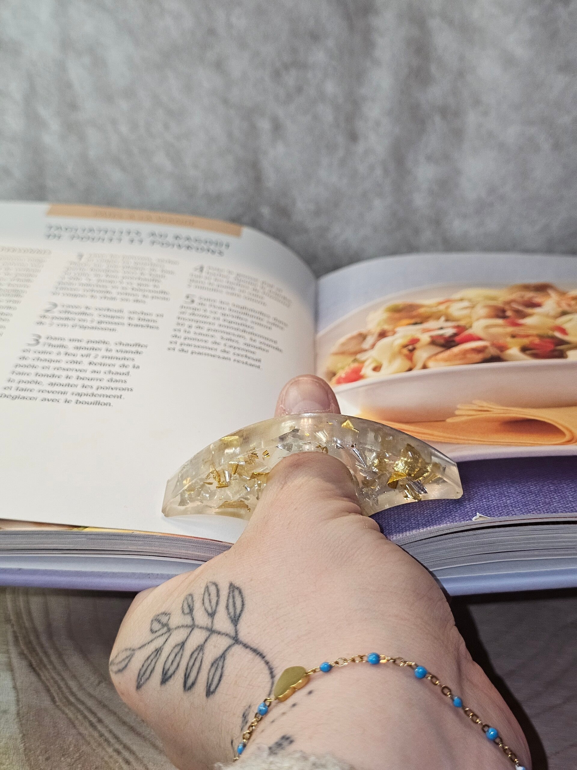 Plongez dans vos lectures avec style, grâce à notre support de lecture ergonomique en résine. Sa forme élégante et sa couleur transparente avec des feuilles or et argent, le rendent non seulement pratique pour tenir votre livre d'une seule main, mais aussi un véritable accessoire de mode pour les amoureux des livres. Profitez d'un confort de lecture optimal et d'une touche d'éclat !