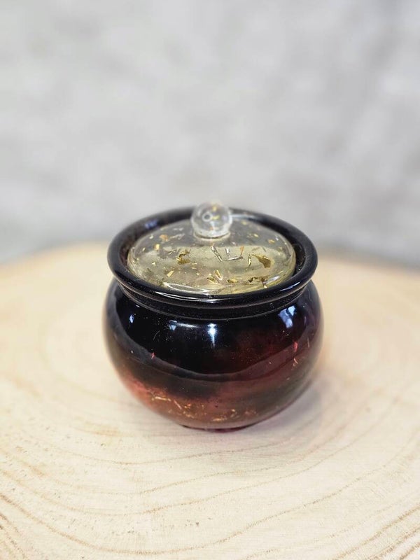 Plongez dans un univers d'élégance et de mystère avec notre pot en résine d'un orange/noir profond et scintillant. Ses reflets irisés captent la lumière, évoquant un ciel étoilé ou une gemme précieuse. Idéal pour sublimer vos bougies, organiser vos pinceaux de maquillage, ou simplement comme objet décoratif unique, ce pot apportera une touche de sophistication et de glamour à votre intérieur.