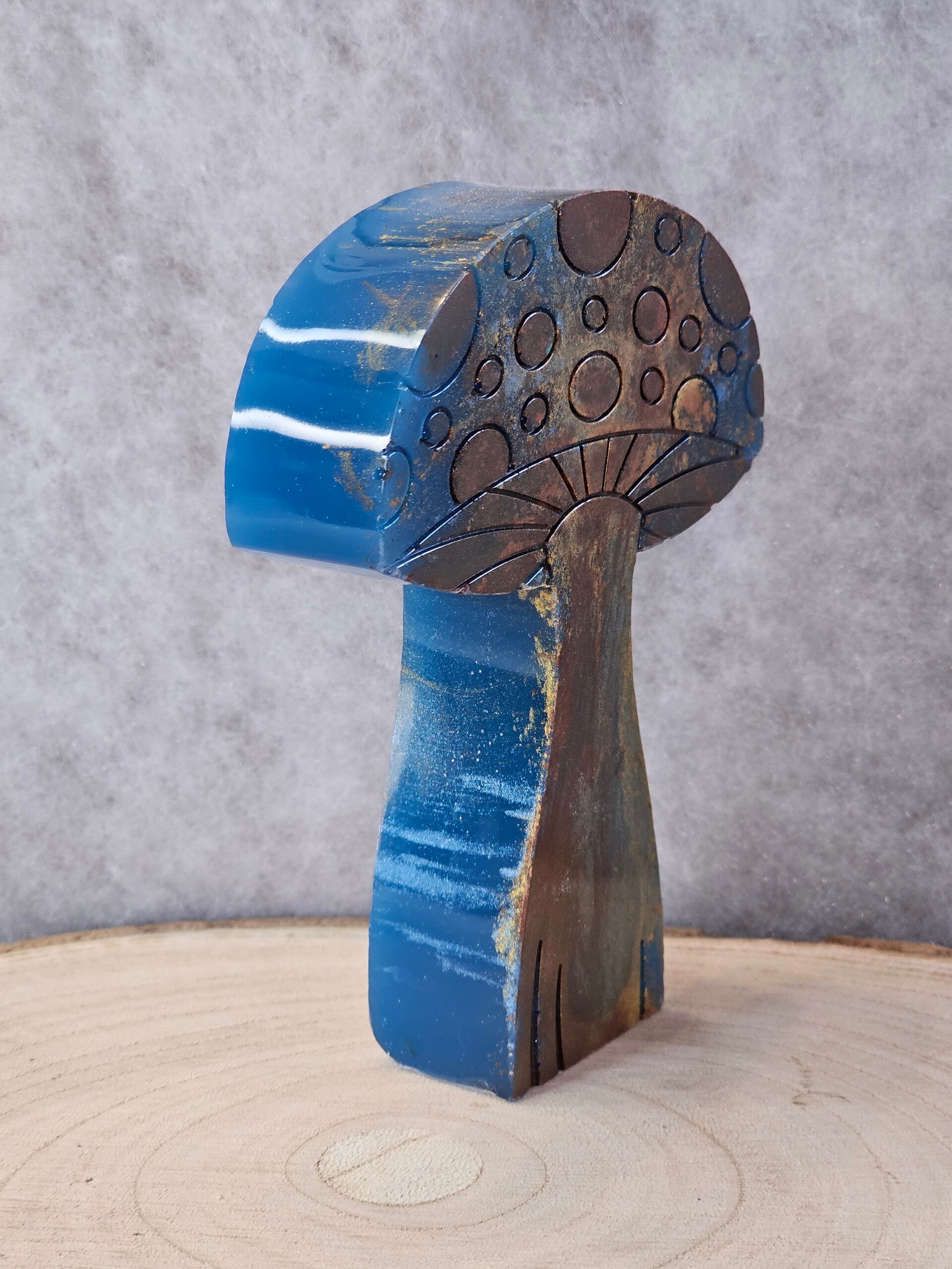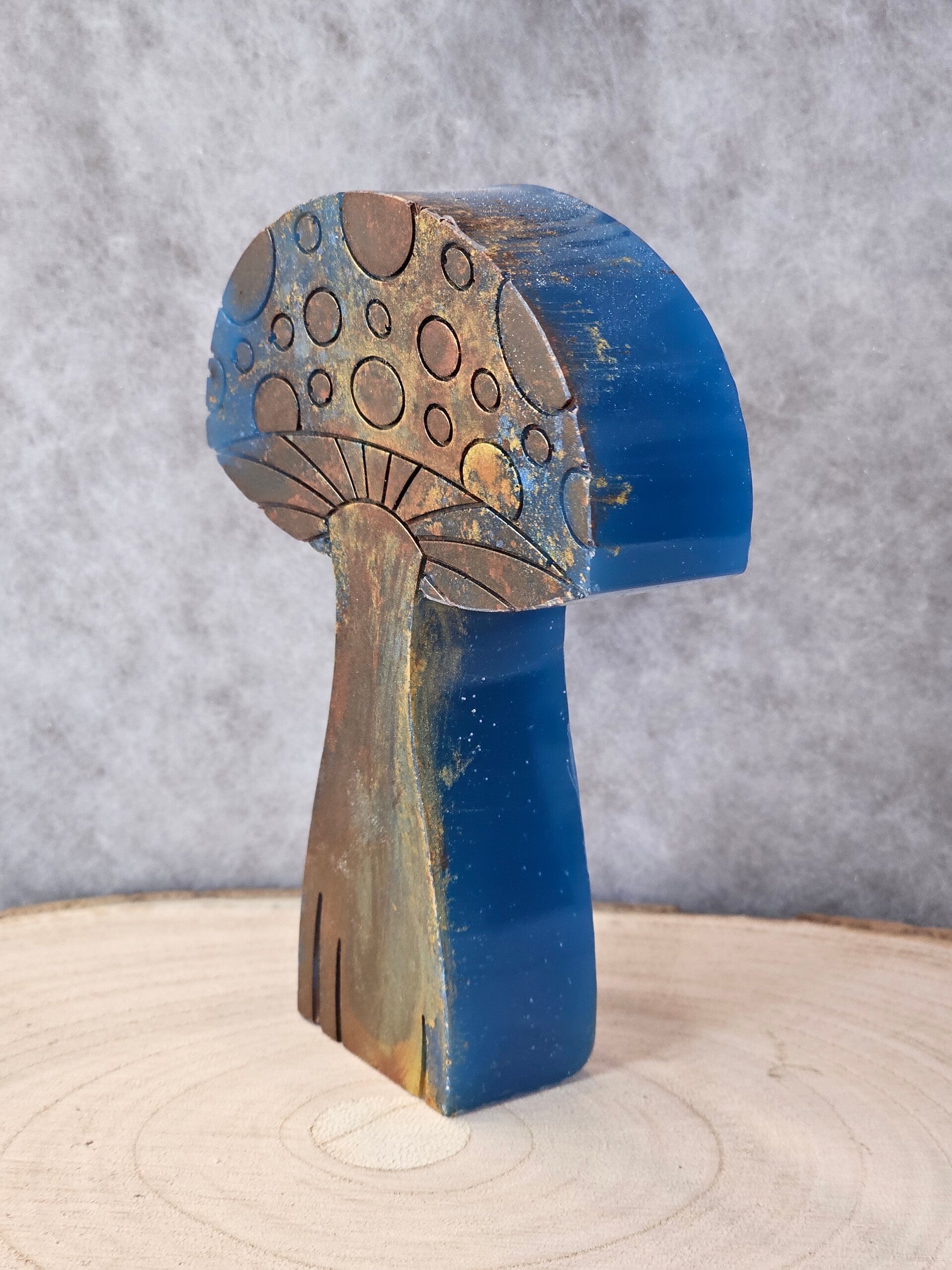 Forme et Couleur : Le chapeau est en forme de demi-cercle très épais et plat. Sa couleur principale est un orange rouille ou brun rougeâtre avec un effet marbré. Le pied est large, évasé à la base, et s'amincit vers le haut. Il est d'un vert menthe ou vert mousse avec des touches de jaune-doré ou de vert-jaune à la base. La résine dans cette partie est plus opaque et a un aspect légèrement patiné ou métallisé.