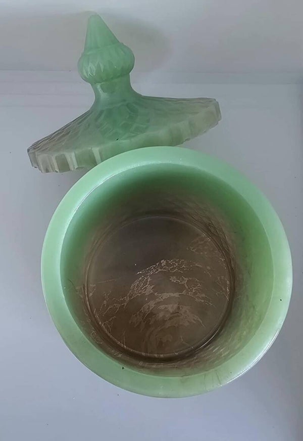 Forme et Texture : Une grande boîte de rangement cylindrique avec un couvercle conique. La surface est couverte d'un motif en losanges ou en diamants en relief.