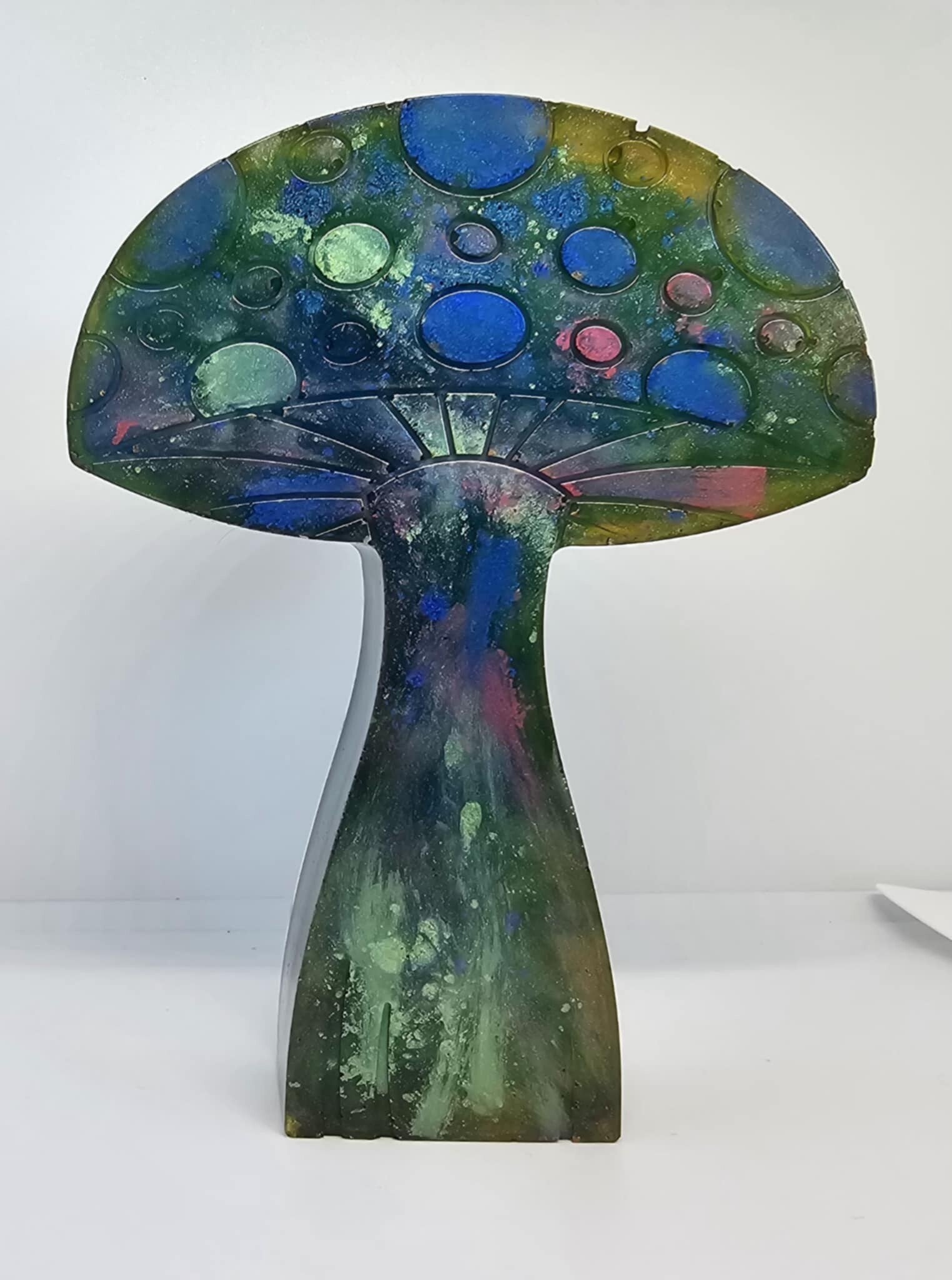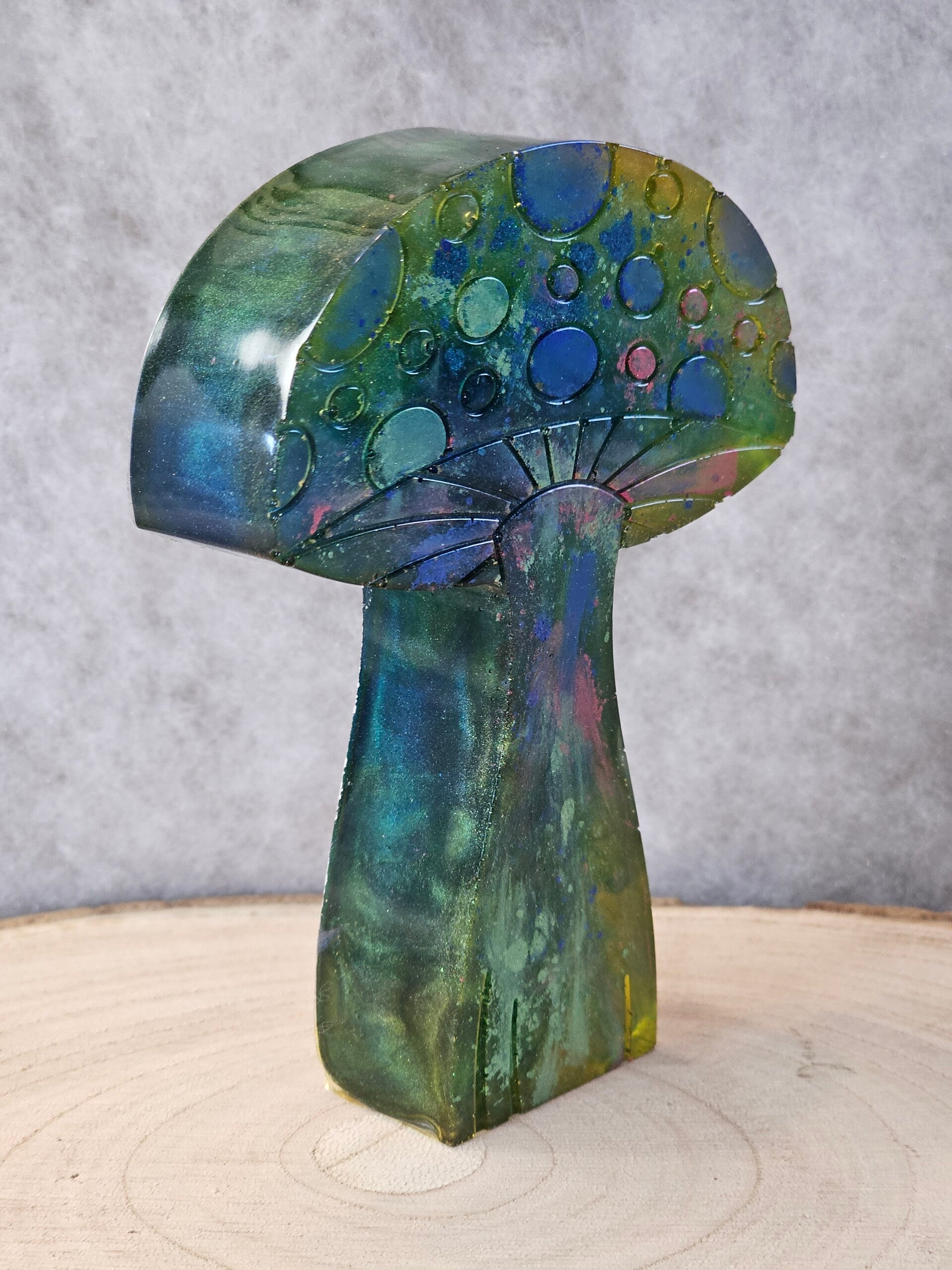 Forme et Couleur : Le chapeau est en forme de demi-cercle très épais et plat. Sa couleur principale est un bleu et vert avec un effet marbré. Le pied est large, évasé à la base, et s'amincit vers le haut. Il est d'un vert menthe ou vert mousse avec des touches de jaune-doré ou de vert-jaune à la base. La résine dans cette partie est plus opaque et a un aspect légèrement patiné ou métallisé.