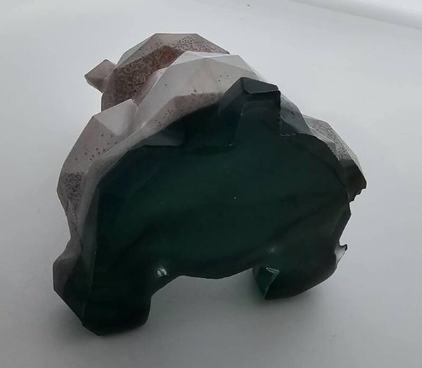 Couleur et Texture: La résine est d'un GRIS, VERT et vif. Le design facetté fait que cette pièce scintille et reflète la lumière de manière très dynamique, accentuant son allure moderne et diamantée.