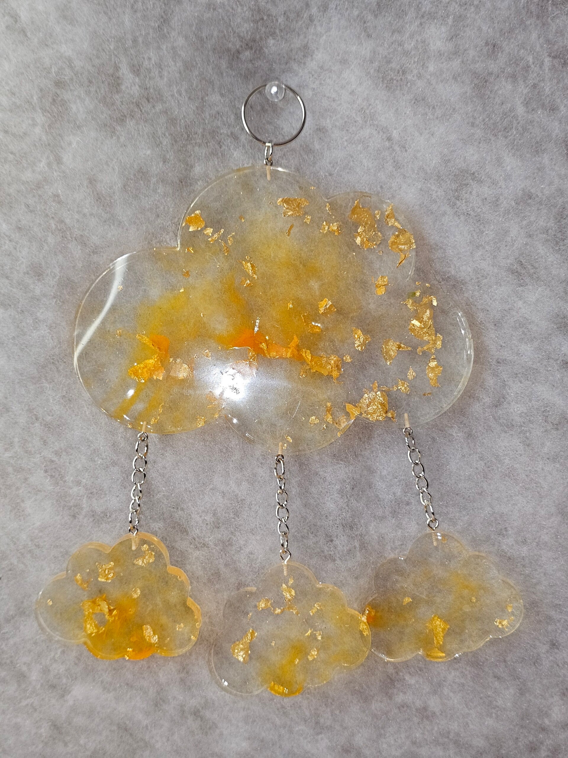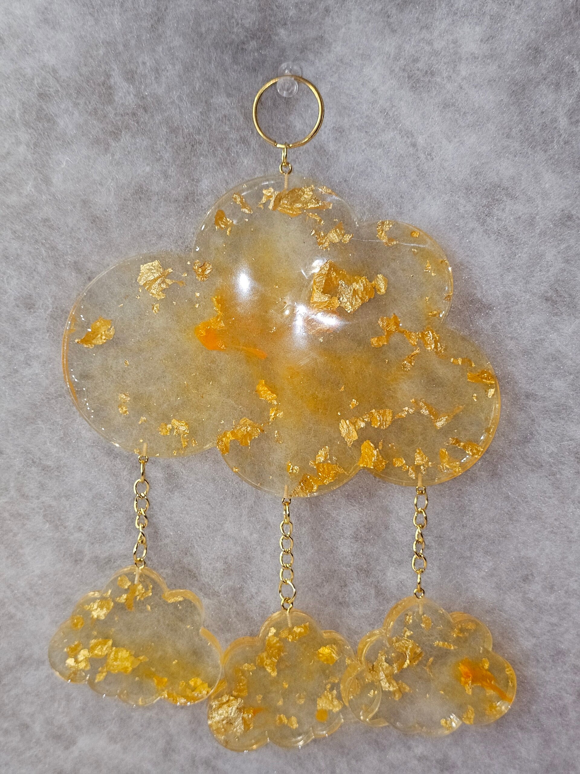 Le motif principal du nuage est un mélange artistique de noir transparent, et d'éclats de feuille d'or. Les petits nuages sont suspendues par de fines chaînes dorées et reprennent le motif noir et or.