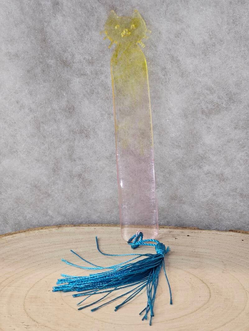 Un marque-page en résine bleu aqua brillant dont l'extrémité supérieure est découpée en forme de tête de chat stylisée. Il est décoré d'inclusions incluant de petits papillons holographiques, une grande forme ronde sombre, une petite étoile de mer dorée, et une fleur/feuille pressée verte. Ce signet est montré avec deux options de houppes : une bleue brillante et une noire mate.